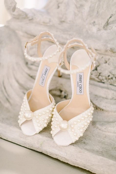 If you’re looking for a high-end option, these shoes are the ultimate pearl-studded accessory: White Satin Sandals with All Over Pearls.