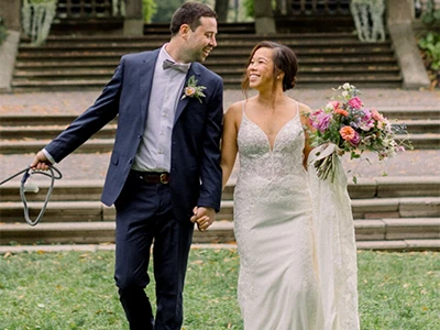 • Real Bride Sophie + Sameer wedding picture in simple A-Line wedding dress.